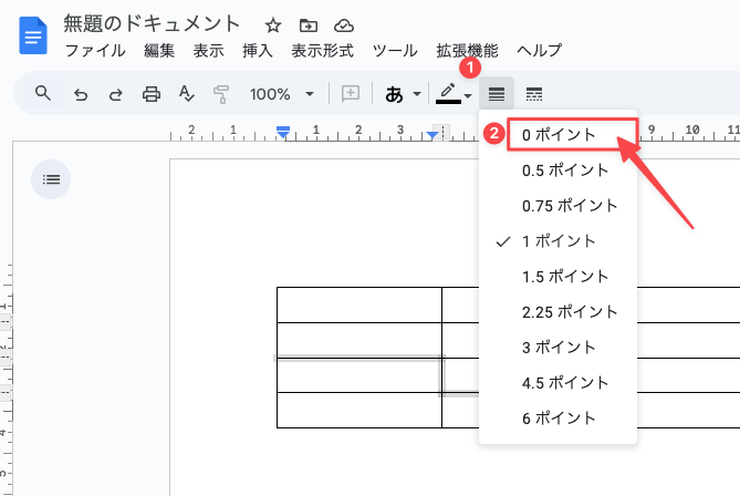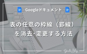 Googleドキュメントの表の任意の枠線(罫線)を表示・消去する方法について解説しました。
